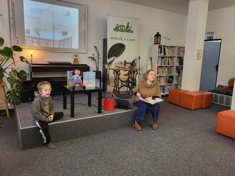 Pani knihovníčka nám premietla rozprávku a pútavo rozprávala o dobrodružstvách Alžbetky a jej kamaráta obláčika. V príbehu sa malý obláčik vydáva s Alžbetkou na cestu po krajine. Spoločne objavujú svet, sledujú zvieratká, stromy, domčeky a učia sa vnímať krásu prírody. Obláčik sa pritom mení – raz pripomína ovečku, inokedy zajačika či draka. Príbeh deťom ukázal, aké dôležité je priateľstvo, fantázia a radosť z objavovania. Deti so záujmom počúvali a aktívne sa zapájali do rozhovoru. Premýšľali, na aké zvieratká sa im obláčik podobá a kam by ho zobrali na prechádzku. Ich odpovede boli plné fantázie a úsmevov.