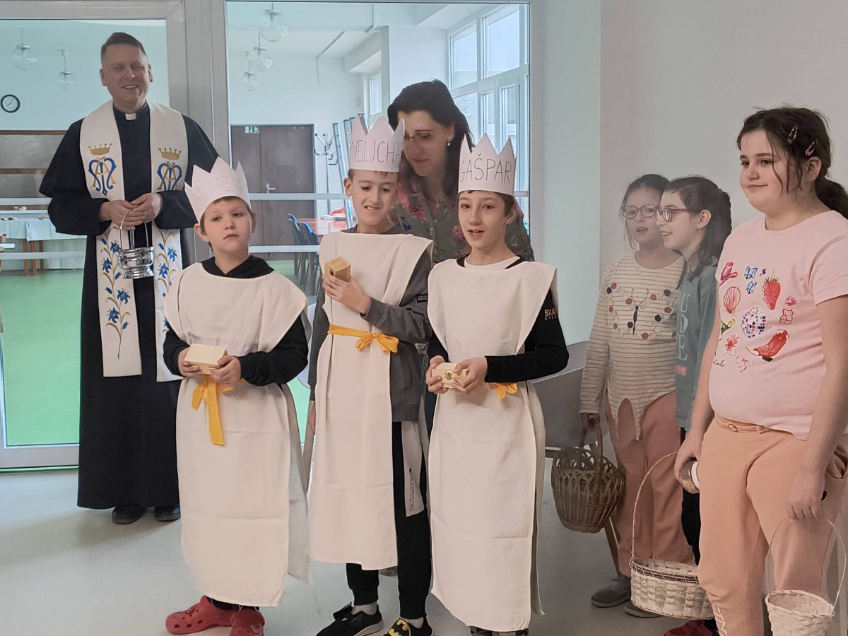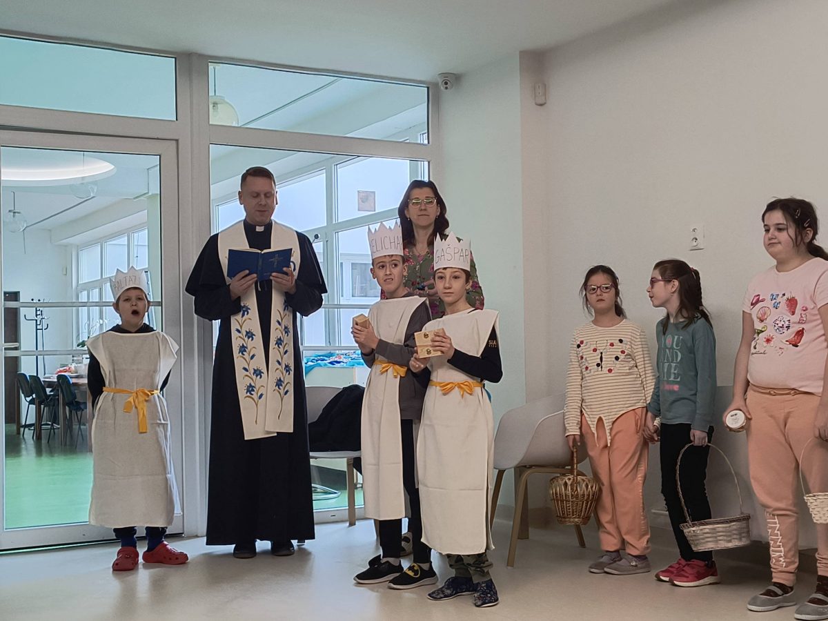 Sprevádzali nás aj traja králi s darmi a spolu sme navštívili každú triedu. Deti si pre Ježiška pripravili malé srdiečka ako symbol lásky a dobra.