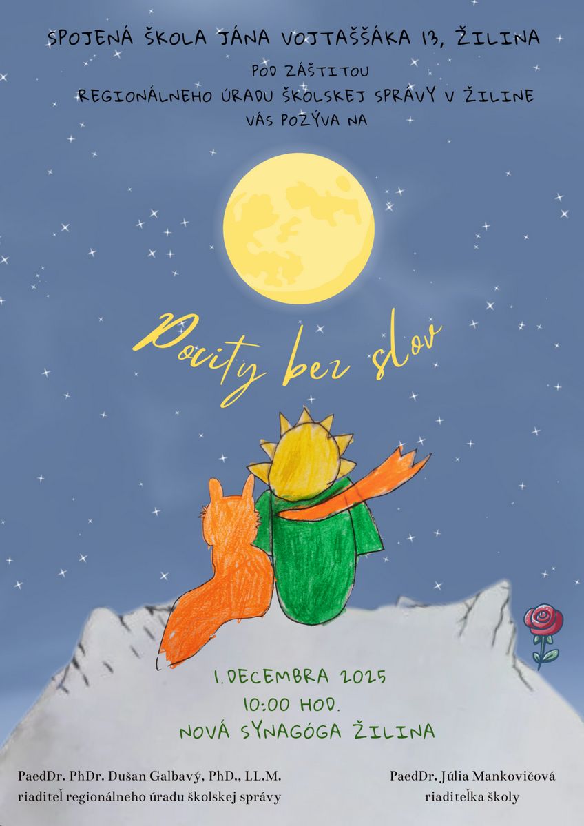 srdečne Vás pozývame na vystúpenie detí a žiakov, na „Pocity bez slov“, ktoré sa bude konať 1. decembra 2025 o 10:00 hod. v Novej Synagóge v Žiline.
